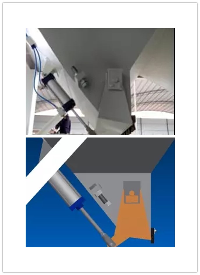對骨料配料系統的改進設計方案:料斗斗口設計優化,充分考慮物料起拱和石子卡門情況,采用減壓式料口和大間隙大斗門結構設計料口和料門結構,本料口結構減小了整個料斗中物料對料口處的壓力,避免物料壓實起拱,大間隙大斗門結構利用骨料的休止角和橡膠件共同作用封閉料口,如果料門發卡時,骨料從大間隙漏下。采用減壓式料口和大間隙大斗門結構設計料口和料門結構,能有效的防止料門卡門,保證料門正常開啟和關閉,提高配料精度。